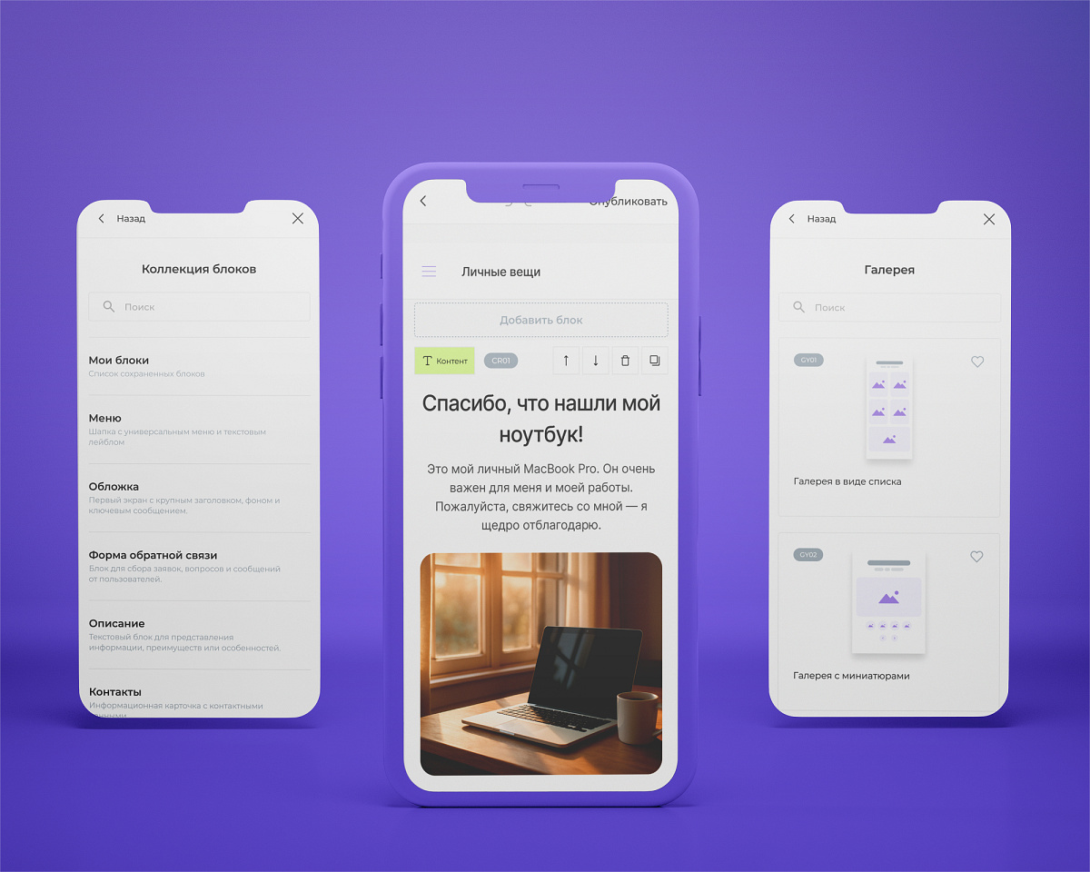 В QRGET сайт собирается из готовых блоков – как конструктор. Каждый блок решает свою задачу: показать информацию, сделать кнопку, загрузить фото или оформить услугу.